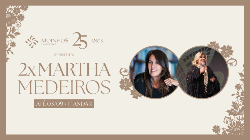 Até 03/09, ocorre a exposição 2x Martha Medeiros no Moinhos Shopping, empreendimento gerido pela AIRAZ Administradora. O evento faz parte da celebração dos 25 anos do shopping, completados em 2025, reforçando seu papel como um palco da cultura e da moda.