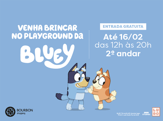 Bluey, o evento transforma a Praça de Eventos do 2º andar em um espaço lúdico e envolvente, perfeito para as férias escolares.