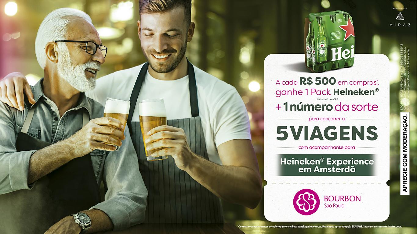 Prêmios: 1 Pack Com 6 Unidades Heineken® por CPF + 1 número da sorte para concorrer a 5 viagens com acompanhante para a Heineken® Experience, em Amsterdã.