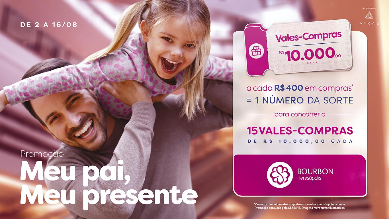 Participam da promoção “Meu Pai, Meu Presente” os shoppings Bourbon Wallig, Bourbon Country, Bourbon Assis Brasil, Bourbon Ipiranga, Bourbon Teresópolis, Bourbon Canoas, Bourbon São Leopoldo, Bourbon Novo Hamburgo e Bourbon San Pellegrino.