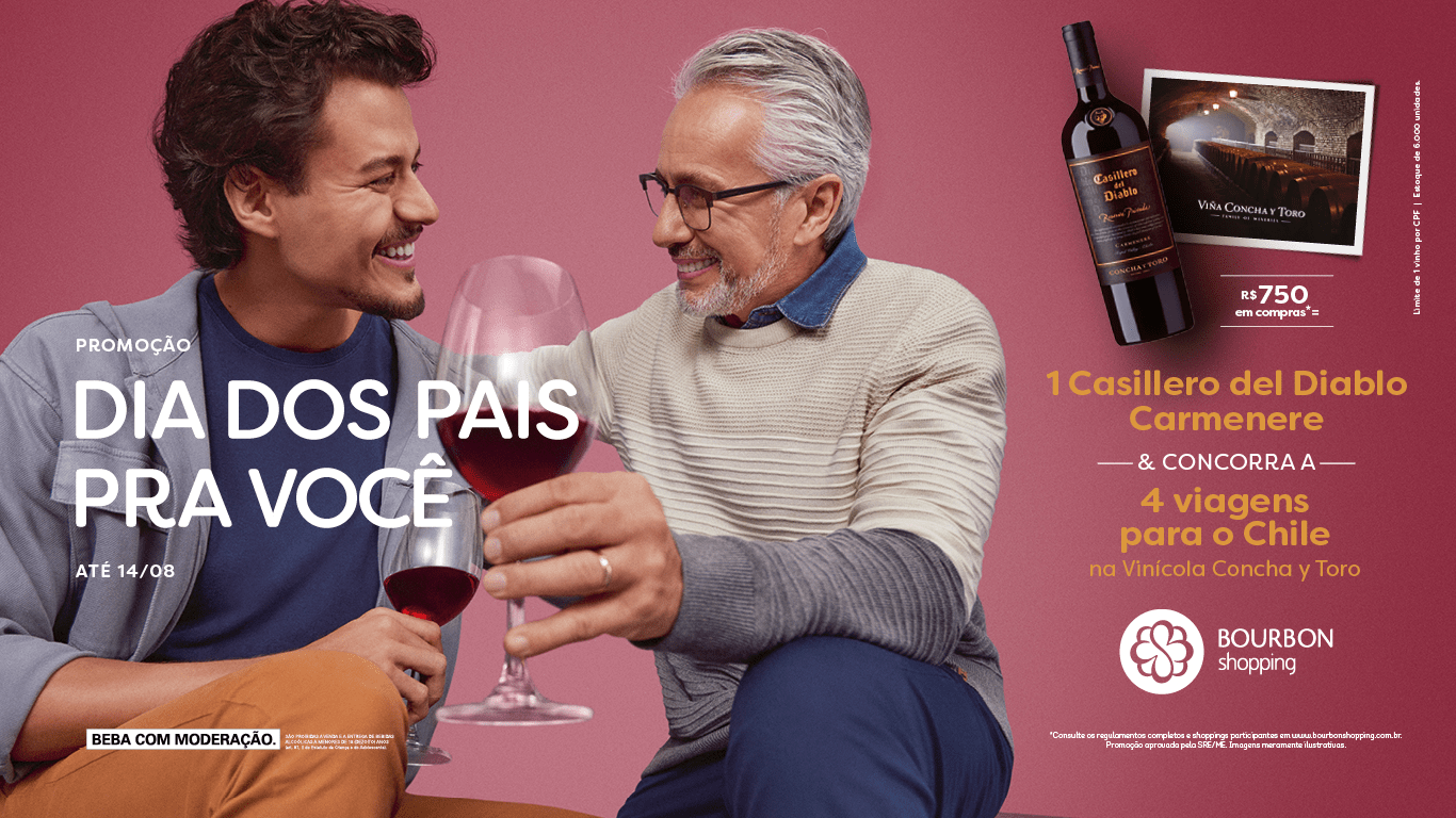 A cada R$ 750 em notas cadastradas no app Bourbon Shopping, o cliente ganha 1 vinho Casillero del Diablo Reserva Privada Carmenere 750ml (estoque limitado a 1 por CPF) e concorre 4 Viagens para o Chile para conhecer a Vinícola Concha y Toro.